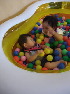 ボールプールで見つめ合う二人。